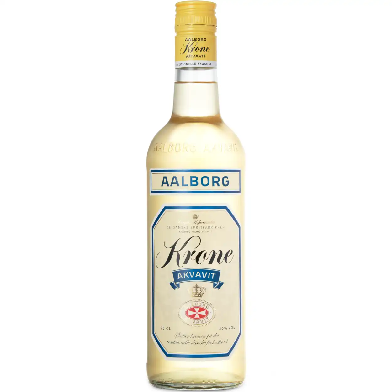 Aalborg Krone Akvavit er en gylden, rund akvavit med kommen, dild og elegante citrus- og kryddernoder – nydes bedst afkølet til klassiske danske retter, fisk og kalvekød.