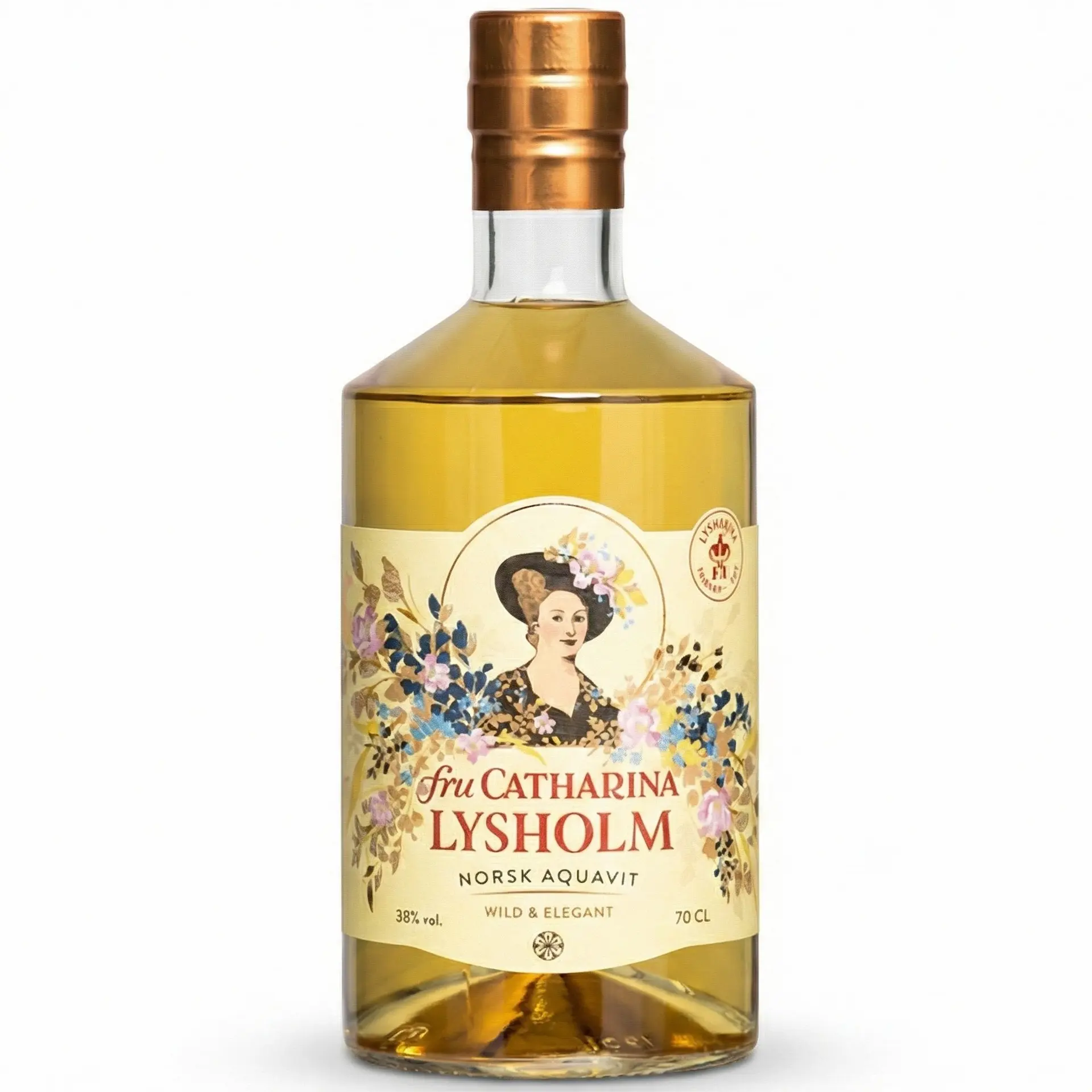 Fru Catharina Lysholm Aquavit er en hyldest til kvinden, der startede det norske akvavit-eventyr. Denne akvavit har lagret i 24 måneder på sherryfade, hvilket giver en usædvanlig harmonisk, blød og kompleks smag med noter af vanilje, kaffe og mørk chokolade. En elegant avec-akvavit, der også løfter det kolde bord.